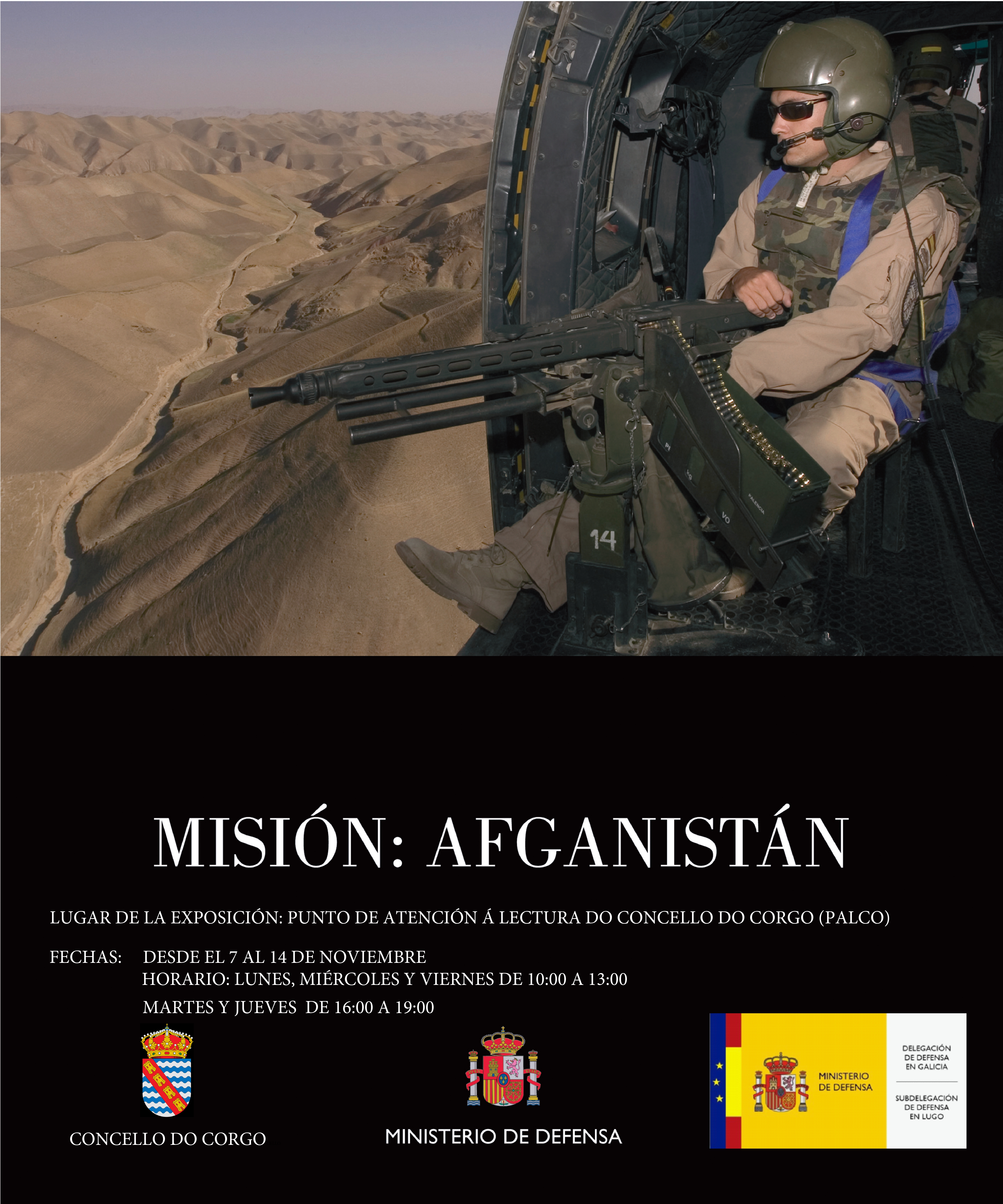 A “Exposición Misión Afganistán” é unha mostra fotográfica itinerante, organizada principalmente polo Ministerio de Defensa de España, que documenta a participación das tropas españolas en Afganistán dende 2002 ata 2014. A exposición presenta imáxenes tomadas por profesionais e militares, maniquíes con uniformes de combate e testemuños para ilustrar a labor cotidiá dos soldados, o esforzo dos máis de 20.000 homes e mulleres que serviron alí, e os desafíos da misión.