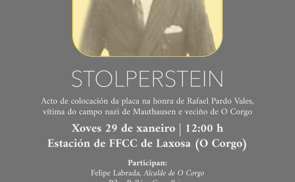 O xoves día 29 de Xaneiro terá lugar o acto de colocación do stolperstein en homenaxe a Rafael Pardo Vales vítima do campo nazi de Mauthusen e nacido en O Corgo.O acto iniciarase ás...